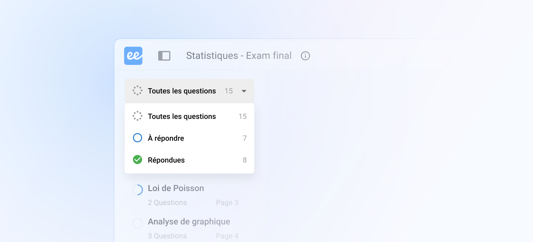 Nous avons clarifiĂ© lâinterface de lâexamen et ajoutĂ© la possibilitĂ© de filtrer les questions. Les Ă©tudiants peuvent maintenant facilement identifier les questions Ă rĂ©pondre restantes.